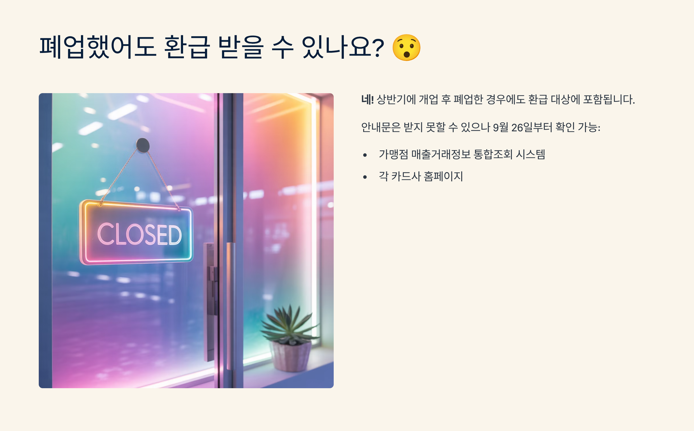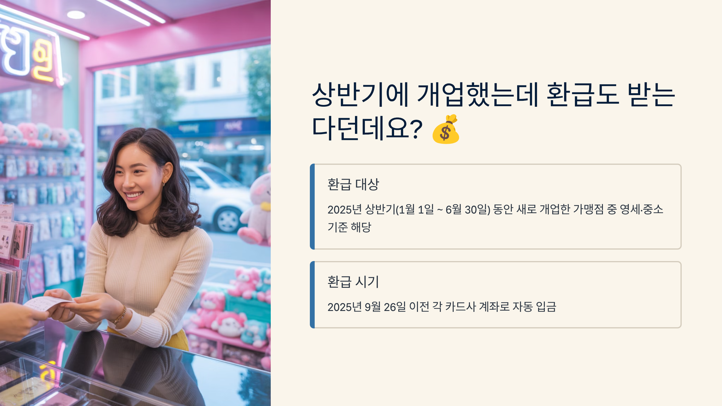 2025년 하반기부터 영세·중소가맹점에 대해 우대수수료율이 새롭게 적용됩니다. 상반기에 신규로 개업했던 가맹점 중 영세·중소로 확인된 곳은 수수료 차액을 환급받을 수 있는 혜택도 있어요.