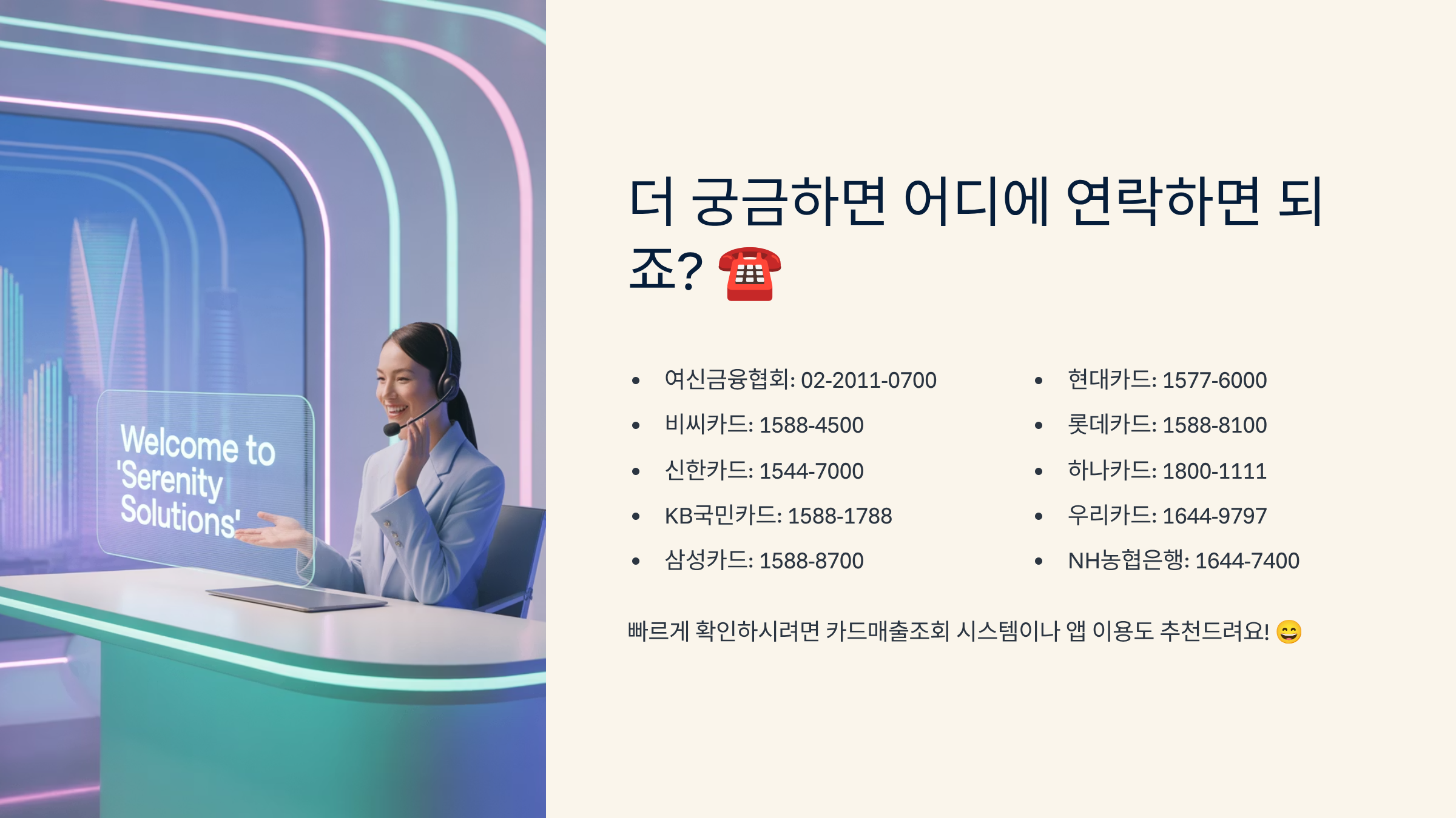 홈페이지나 카드사 콜센터, 카드매출조회 시스템에서도 확인 가능합니다.