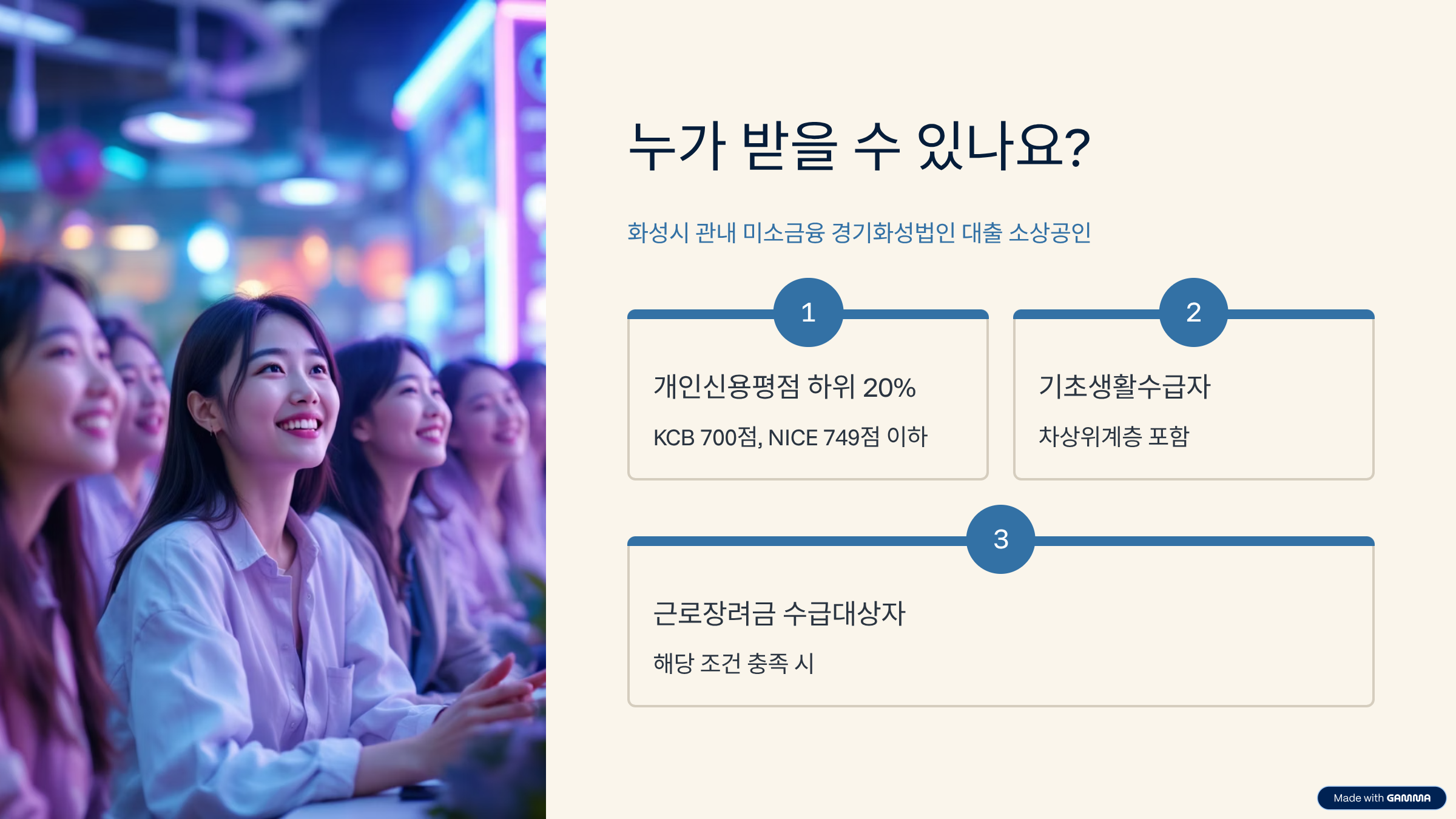 화성시 관내에서 미소금융 경기화성법인을 통해 대출을 받은 소상공인이라면 지원 대상에 포함됩니다.