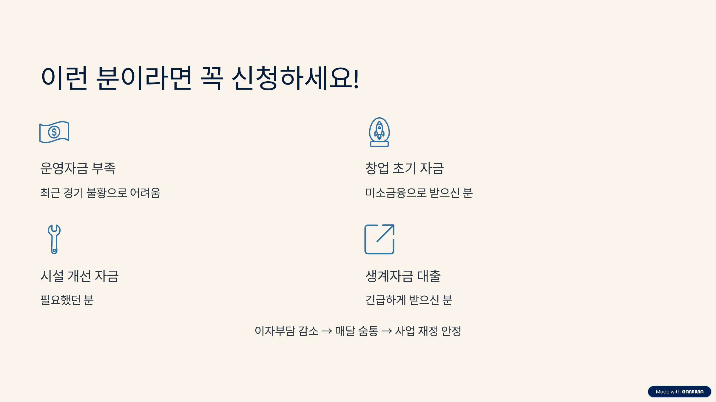 | 대상 | 저신용 소상공인 (기초수급, 차상위, 신용하위 포함) |