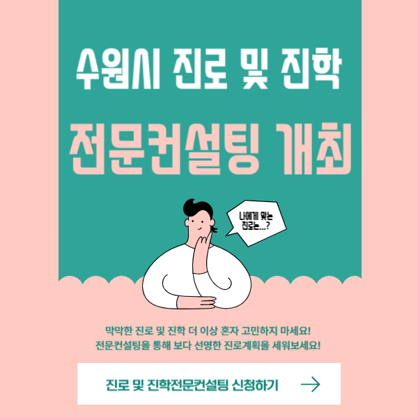 자세한 내용은 수원특례시 진로 · 진학 전문컨설팅 홈페이지에서 참고하셔서 자신에게 맞는 진로와 진학에 도움되시길 바랍니다. (수원특례시 진로 · 진학 전문컨설팅 (swjinro.or.kr) ← 바로가기