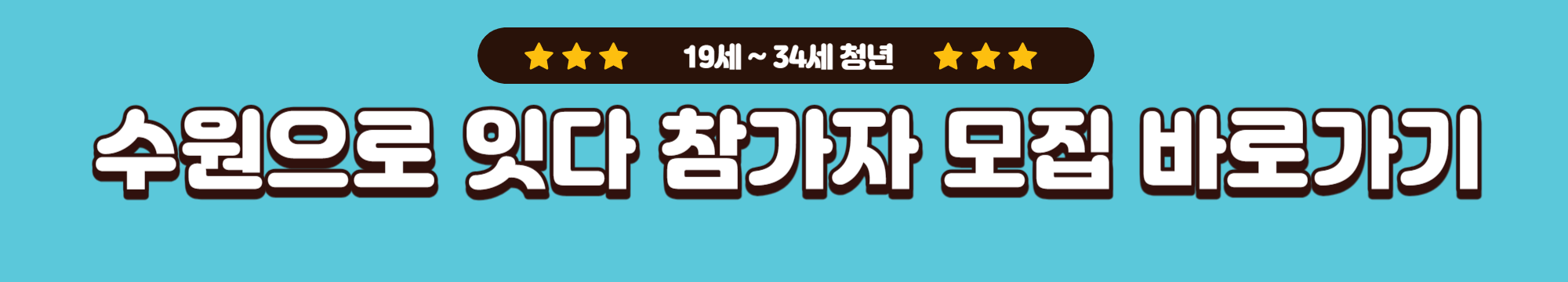 수원 청년 여러분, 다채로운 경험의 문을 열어보세요! '소셜다이닝, 문화힐링, 익스트림 스포츠'를 '수원으로 잇다'에서 여러분을 기다립니다. 모집 기간은 23년 8월 16일 (수)부터 8월 28 (월)까지이며, 운영기간은 23년 9월 7일 (목)부터 11월 11일 (토)까지입니다. 우리 도시의 맛있는 음식과 문화적 치유, 그리고 스릴 넘치는 스포츠까지 함께 즐겨보세요. 새로운 친구들과의 만남, 함께하는 미소와 추억, 그 모든 것을 '수원으로 잇다'에서 느껴보시기 바랍니다. 청춘의 열정을 품은 이 특별한 경험을 즐겨보시기 바랍니다.