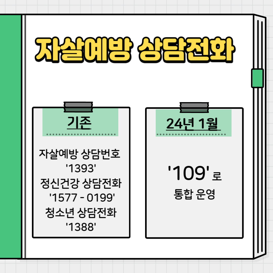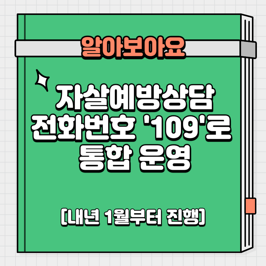 통합된 '109' 번호는 2024년 1월부터 운영될 예정이며, 이를 통해 자살 예방과 생명 존중 문화 확산에 기여할 것으로 기대가 됩니다.