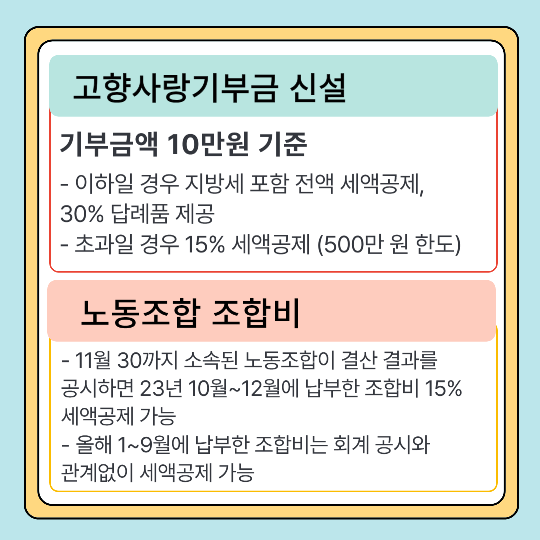 노동자들을 위한 세액 혜택인 노동조합 조합비가 새로운 규정에 따라 적용됩니다. 소속된 노동조합이 11월30일까지 결산 결과를 공시하면, 해당 연도 10월부터 12월까지 납부한 조합비에 대해 15%의 세액공제가 가능합니다.