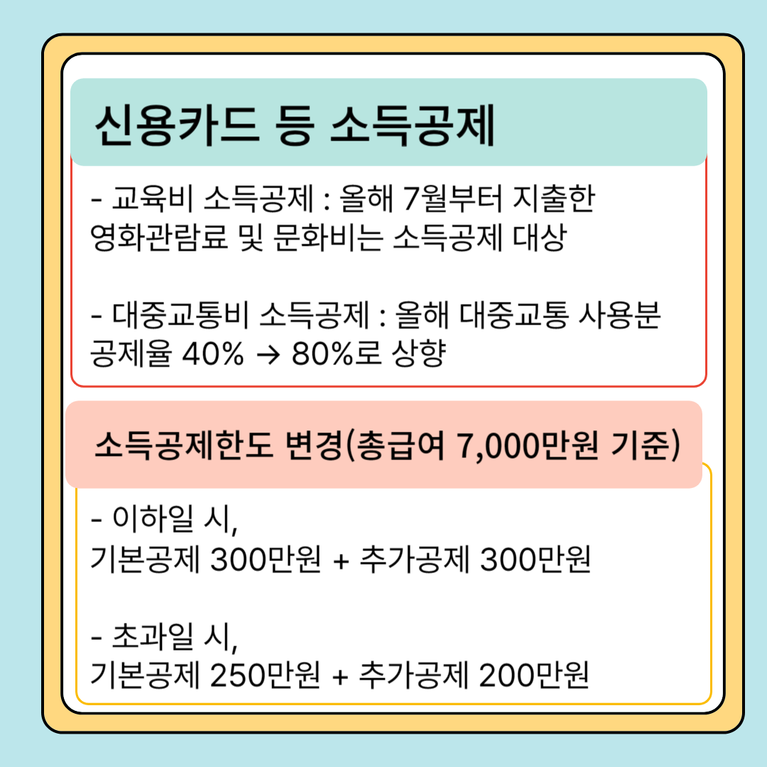 2023년에 변경된 소득공제한도는 총급여 7,000만 원 기준으로 적용됩니다. 총급여가 이 기준 이하인 경우, 기본공제는 300만 원, 추가공제는 300만 원(전통시장, 대중교통, 도서공연 포함)입니다.